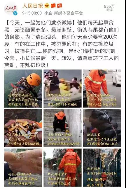 【今天,一起為他們發條微博】他們每天起早貪黑,無論酷暑寒冬。懸崖峭壁,街頭巷尾都有他們的身影。為了清理煙頭,他們每天至少要彎200次腰;有的在工作中,被辱罵毆打;有的在撿垃圾時,被撞身亡……你的假期,是他們最忙碌的時刻!放假期間轉發,請尊重環衛工人的勞動,不亂扔垃圾!